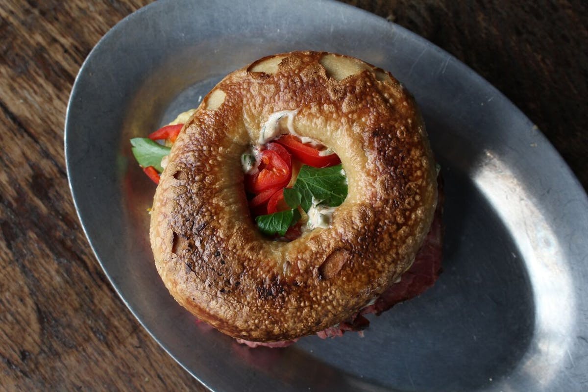 Gramercy Tavern is excited to announce our month-long collaboration with Black Seed Bagels, a modern-day NYC bagel shop steeped in old-world tradition. Black Seed’s executive chef, Dianna Daoheung and our own Chef Michael Anthony worked closely to develop the “Gramercy Tavern Bagel,” a rye bagel topped with house-made Vermont wagyu pastrami, soft scrambled eggs, Fresno chiles, and a smoked onion sauce. This collaboration not only pulled inspiration from both restaurants’ menus but also amplified unexpected ingredients in a bagel sandwich.